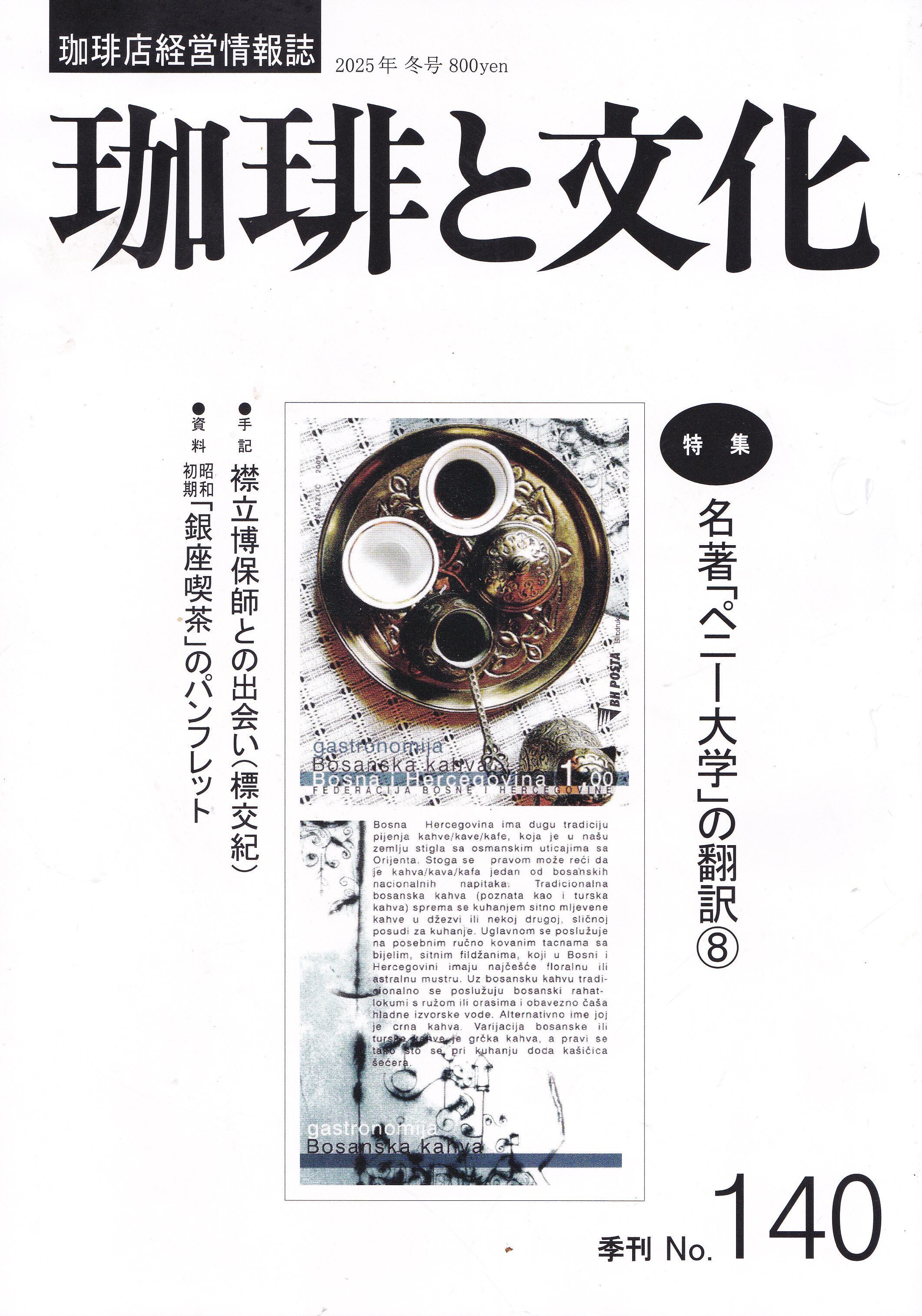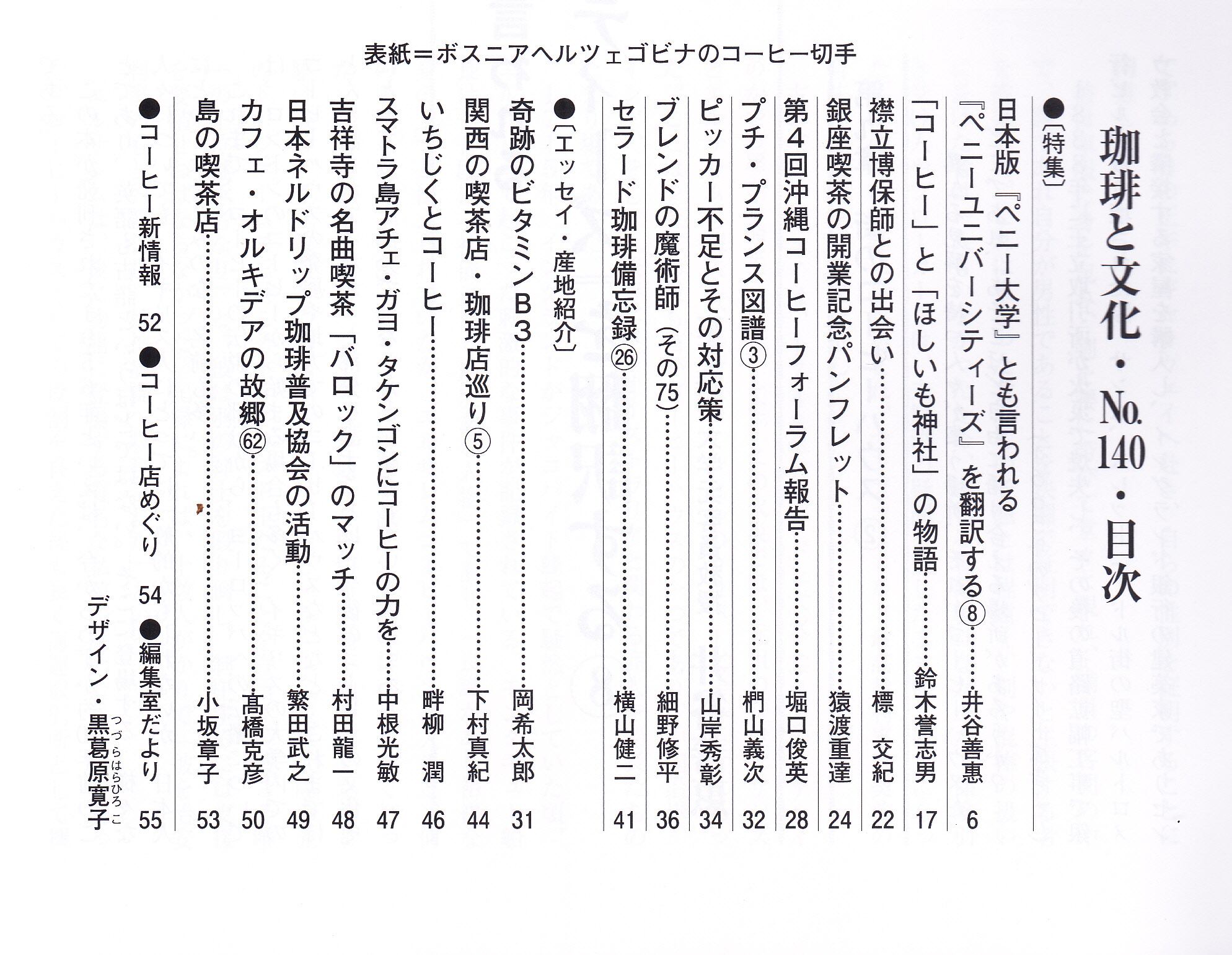 代表星田宏司さん、いなほ書房が発刊する季刊誌です。四季の珈琲と同様書店での取り扱いのない雑誌です。日本や諸外国の珈琲の歴史やエッセイ、身体と珈琲の関係や科学的な分析等、一般的なコーヒー雑誌とはひと味違う視点と深さをもつ内容です。難しい書き方ではなくすべてが温かみのある表現で綴られています。当店でも世話になっているインポーターの代表も寄稿しています。コーヒーブレイクに心地よい雑誌です。